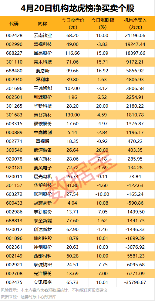 今日龙虎榜中,净买入个股有17只,净卖出的个股为12只。9股净买入金额均超2000万元,云南锗业获机构净买入2.12亿元,居首;其次是盛视科技、品高股份,机构净买入金额均超1.8亿元。