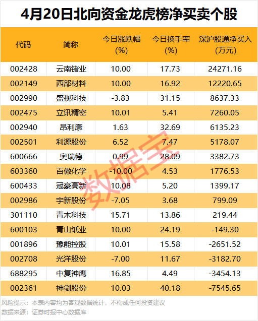 今日龙虎榜现身个股中,11股获北向资金净买入。净买入居首的是云南锗业,金额为2.43亿元。西部材料、盛视科技等紧随其后,净买入金额均超8000万元。