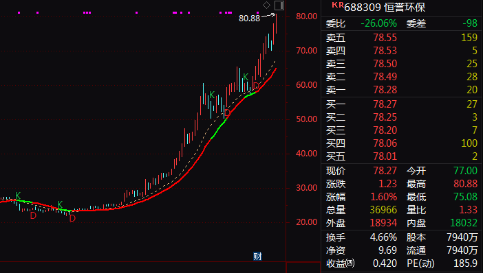 今年以来,恒誉环保股价走势强劲,年内累计上涨224.37%,截至4月21日,最新收盘价78.27元/股,市值62亿元。