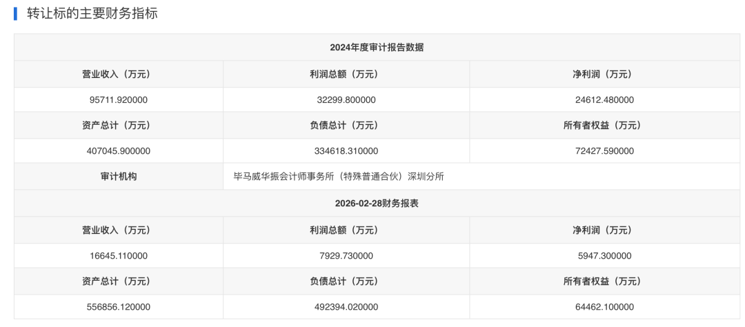 根据上海联合产权交易所发布信息,2024年度审计报告数据显示,华润成都发展公司当年完成营业收入9.57亿元,实现净利润2.46亿元。今年截至到2026年2月28日的财报显示,该公司营业收入和净利润分别为1.66亿元和0.59亿元;华润成都发展公司资产总计为55.69亿元,负债总计49.24亿元,所有者权益为6.45亿元。