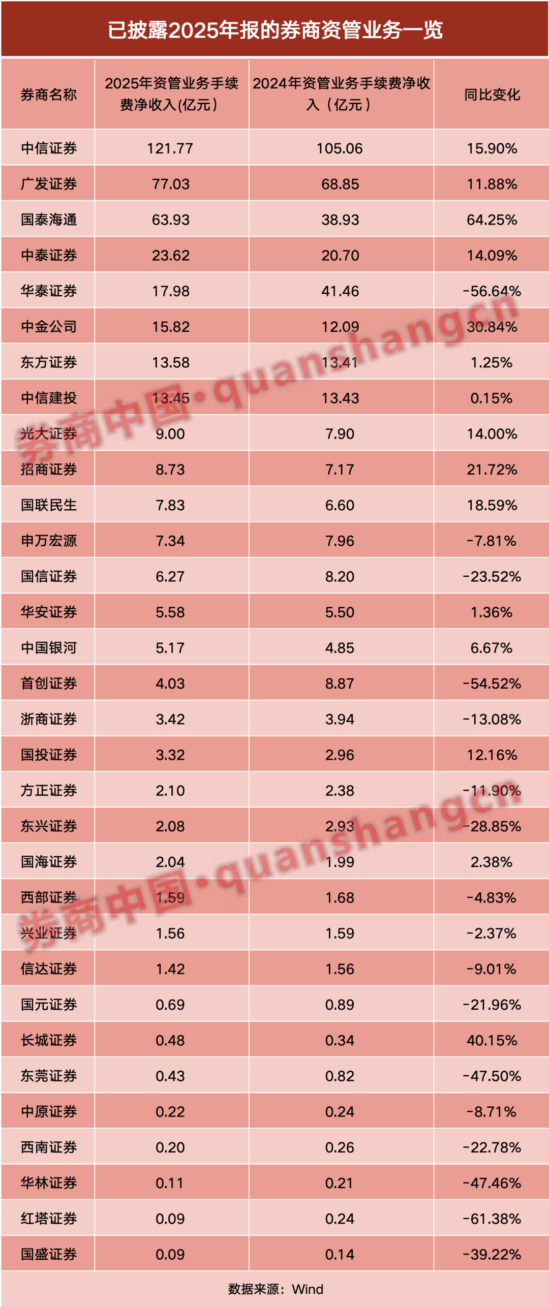 值得注意的是,2025年资管业务手续费净收入前十名券商合计实现收入365亿元,占上述32家券商总收入的87%,较上一年同期提升5个百分点,行业集中度进一步加剧。