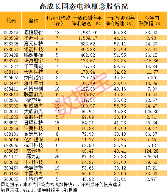 一批高成长股浮现。5家及以上机构评级的固态电池概念股中,有27只个股机构一致预测今年、明年净利增速均超30%。其中,鹏辉能源、恩捷股份、嘉元科技等个股机构一致预测两年净利增速均超50%。