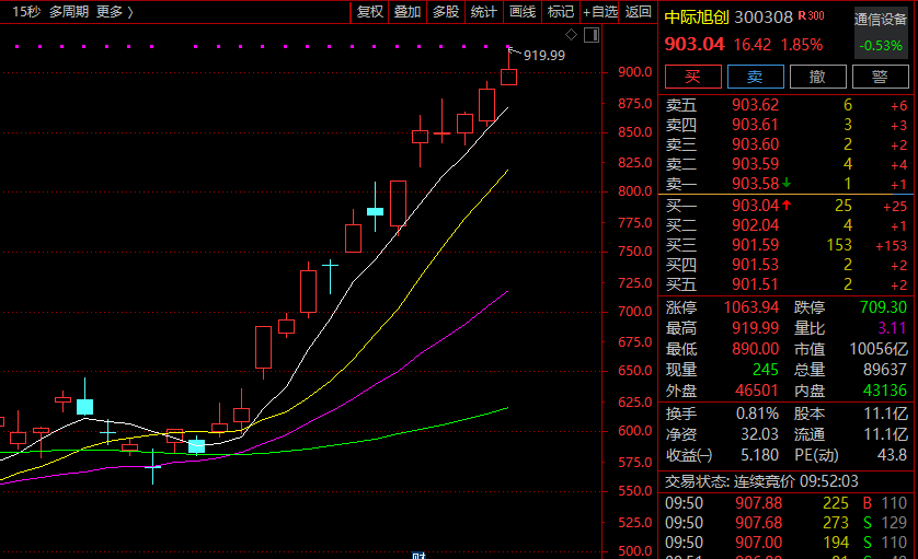 中际旭创(300308)盘中一度涨超3%,成为继工业富联后第二只总市值突破1万亿的算力硬件股,该股自去年4月22日以来累计上涨超900%。