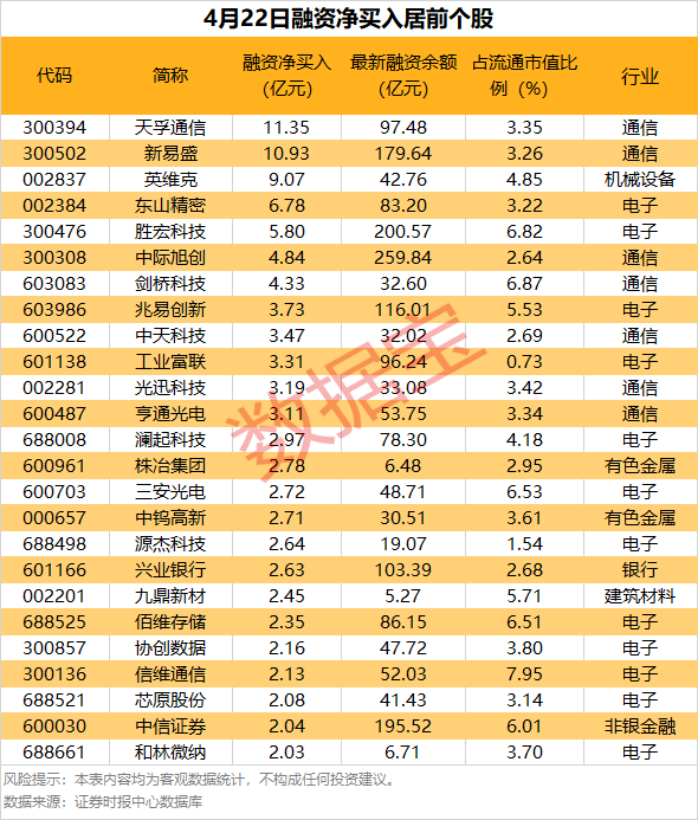 具体到个股,4月22日共有1845只股获融资净买入,净买入金额在1亿元以上的有54只,其中5只融资净买入额超5亿元。天孚通信融资净买入额居首,当日净买入11.35亿元,其次是新易盛、英维克,融资净买入金额分别为10.93亿元、9.07亿元,融资净买入金额居前的还有东山精密、胜宏科技、中际旭创等。