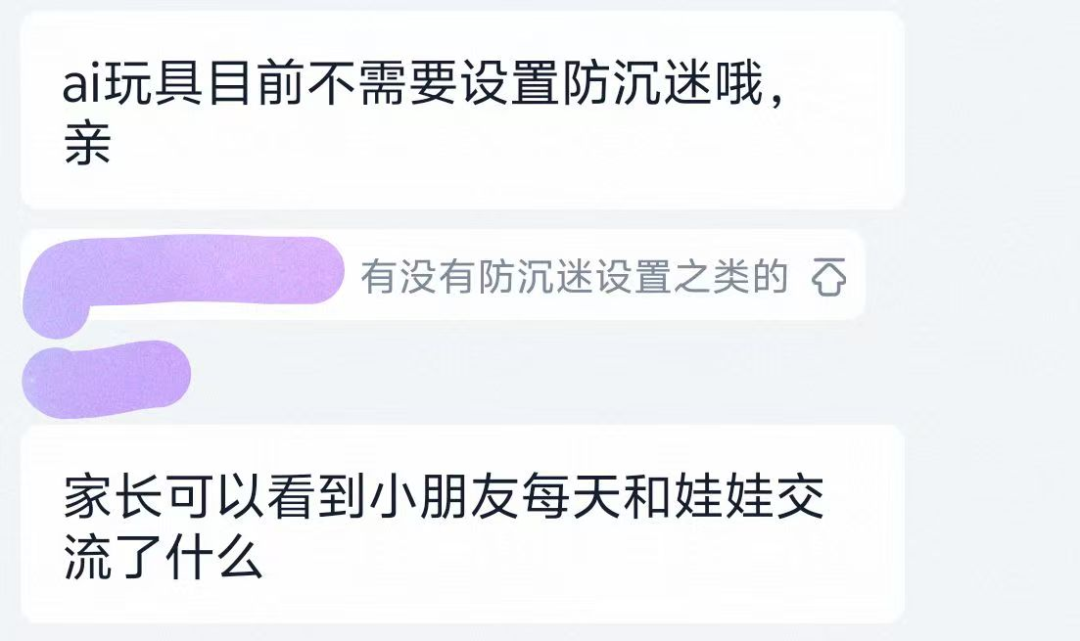 在另一家价格偏高的AI玩具旗舰店,客服推荐了今年3月上市的兔头外形拟人AI玩具。该玩具亦配备了“成长记录”,家长可以在手机小程序查阅孩子和AI玩具的对话记录、使用时间等。不过,该店客服明确表示:AI玩具目前不需要设置防沉迷。
