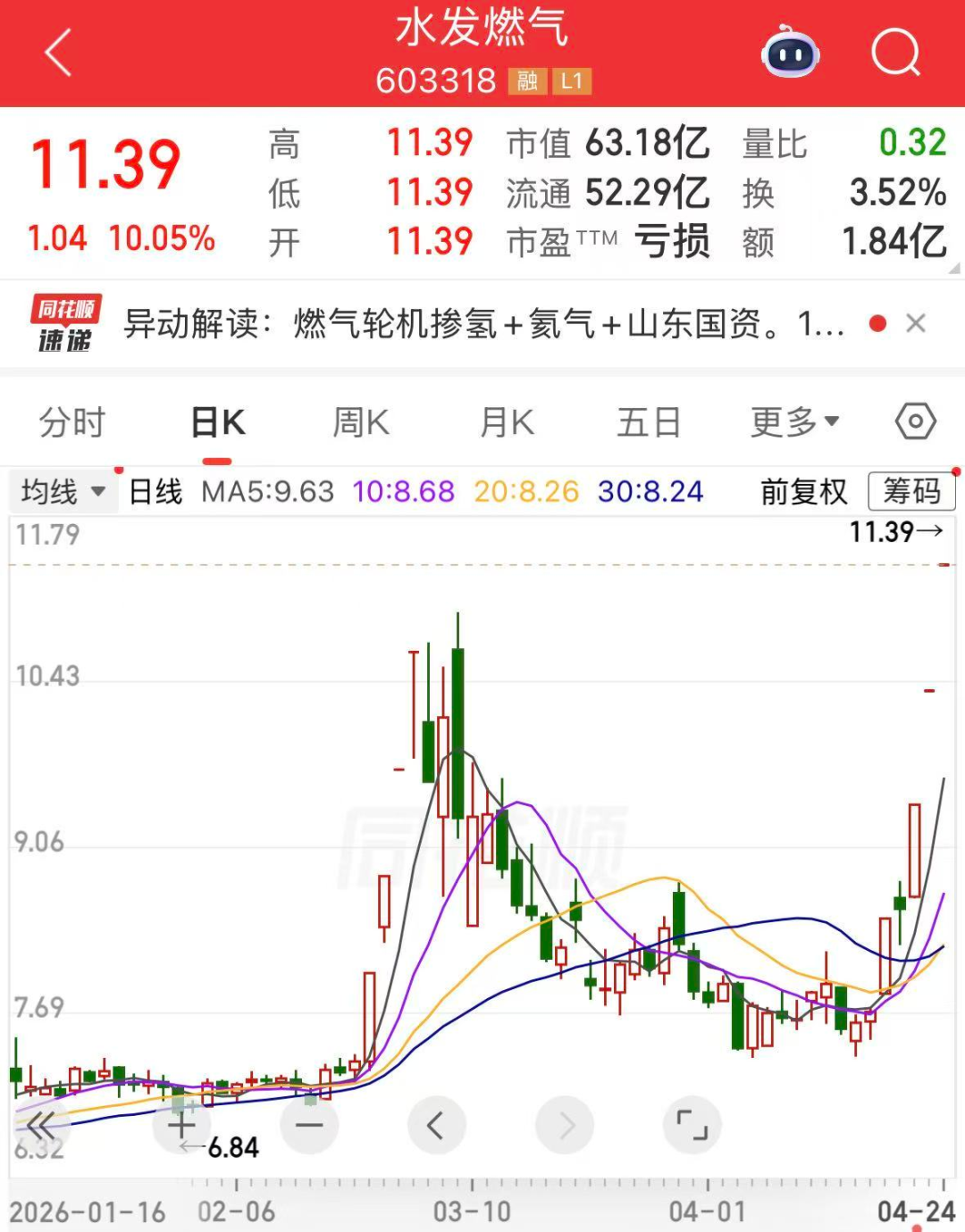 今日(4月24日),水发燃气(603318)再度涨停。本周5个交易日中,该股收获4个涨停板,一周累计涨47.92%。