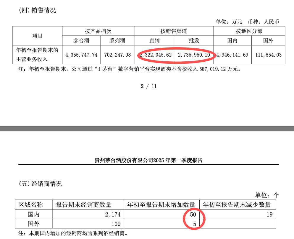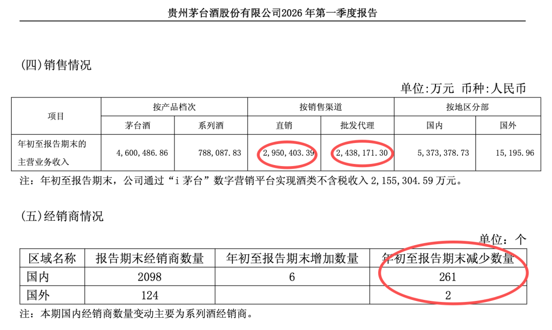 4月24日晚间,贵州茅台(600519)发布2026年一季报,经营业绩实现微增,但营销体系出现显著变化,直销渠道销售额超传统批发渠道51亿元,经销商净减少255家。