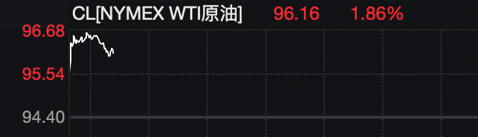 原油大幅高开。截至发稿,WTI原油报96.16美元/桶,涨幅为1.86%。
