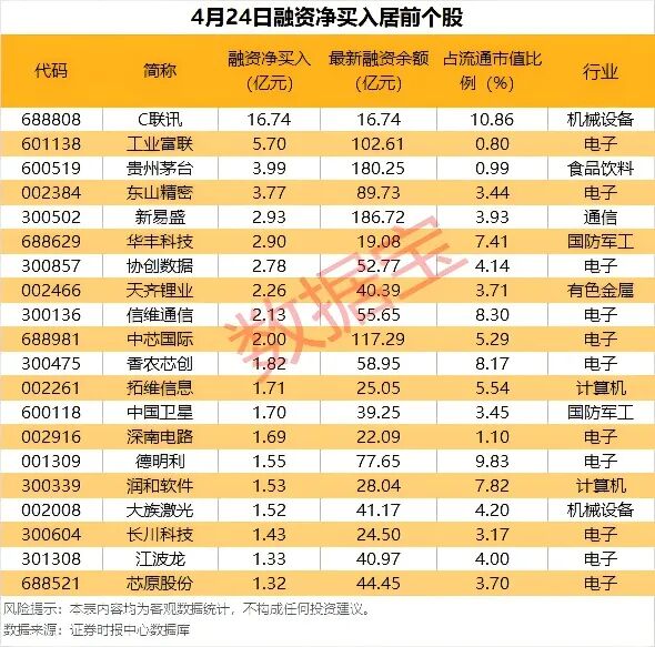具体到个股,4月24日共有1519只股获融资净买入,净买入金额在千万元以上的有399只,其中37只融资净买入额超1亿元。C联讯(688808)融资净买入额居首,该股上市首日最高涨超950.17%,上市当日融资净买入16.74亿元,占流通市值的比例10.86%。