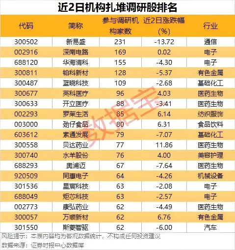 近两个交易日(4月23日至4月24日)共有80家公司公告机构调研记录,其中,5家公司获超百家机构扎堆调研。最受关注的是光模块龙头公司新易盛,有231家机构调研,公司在机构调研时表示,公司1.6T光模块订单相对于去年增幅很大,预计在今年逐季快速增长,1.6T和800G是今年交付的主力产品。公司还表示,预计2027年行业仍将保持超高景气度和高增长趋势,公司将会持续扩充产能以满足订单交付。