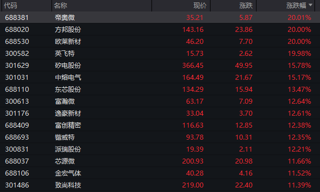 主要行业板块和赛道方面,若按照申万一级行业划分,电子板块领涨,板块盘中涨幅超过3%,板块内个股再度掀起涨停潮,盘中近30股涨停或涨幅超过10%,其中欧莱新材(688530)开盘3分钟即涨停,帝奥微、方邦股份、英飞特等股票盘中亦“20cm”涨停;矽电股份、中熔电气、东芯股份等多股涨幅超过10%。