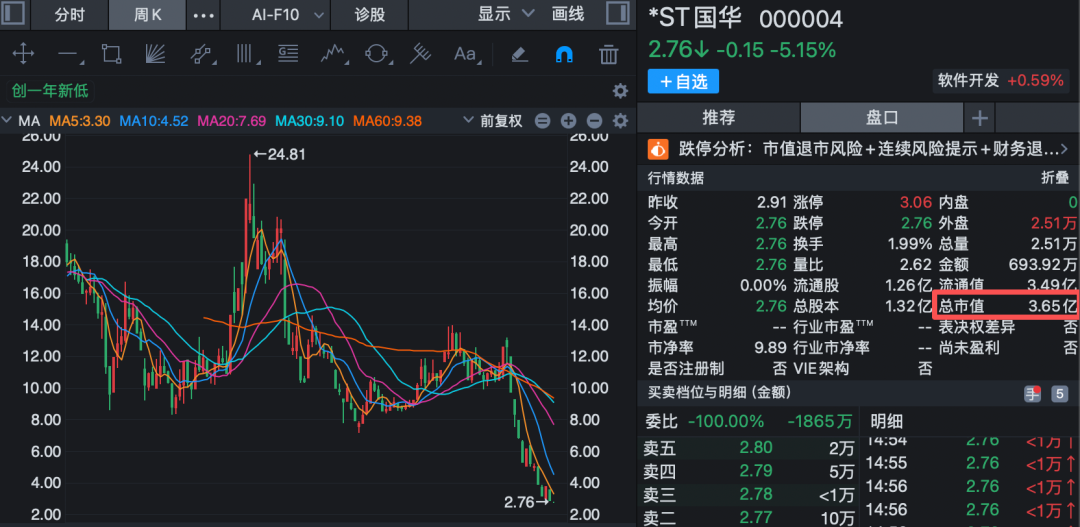 4月27日,A股“元老级”股票*ST国华(000004)再度跌停,收盘报2.76元/股,总市值仅余3.65亿元。这是其连续第15个交易日总市值低于5亿元,即便未来5个交易日连续涨停,其总市值仍无法重回5亿元门槛之上。作为深交所首批挂牌的“老五股”之一,这家上市35年的企业将迎来告别时刻。