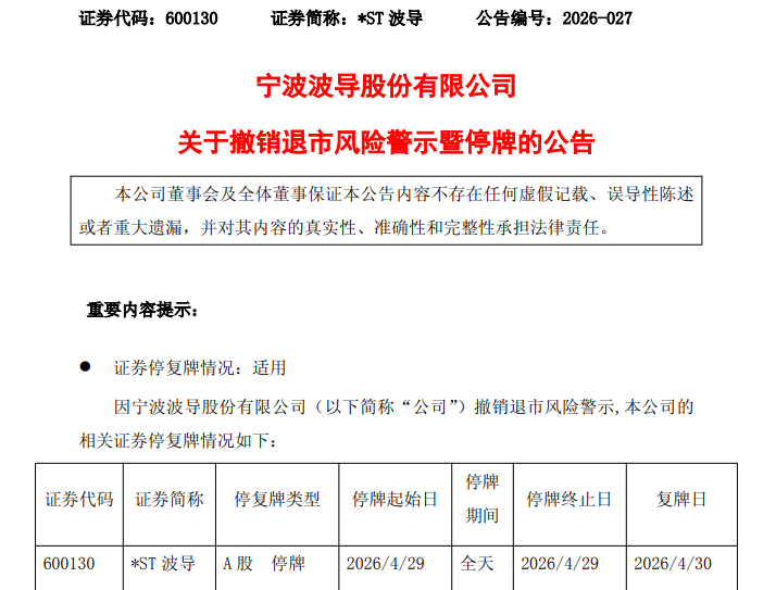 4月28日晚,*ST波导(600130)发布公告,公司股票将撤销退市风险警示,证券简称由“*ST波导”变更为“波导股份”,公司股票将于4月29日停牌一天,4月30日起复牌并正式撤销相关风险警示。