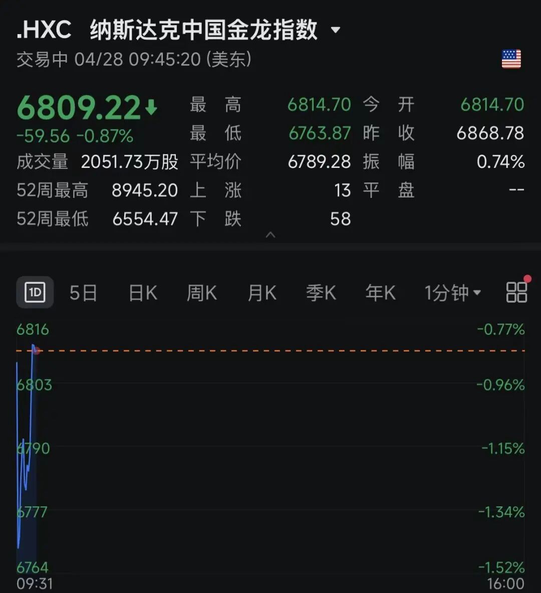 中概股方面,纳斯达克中国金龙指数跌超0.8%,跌幅也大幅收窄,个股方面,金山云、网塑科技等跌幅居前。