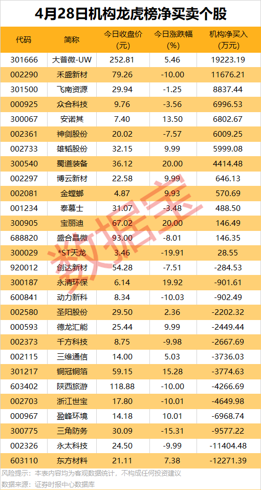 今日龙虎榜中,净买入与净卖出的个股均为14只。8股净买入金额均超4000万元,大普微-UW获机构净买入1.92亿元,居首;其次是禾盛新材、飞南资源,机构净买入金额均超8000万元。