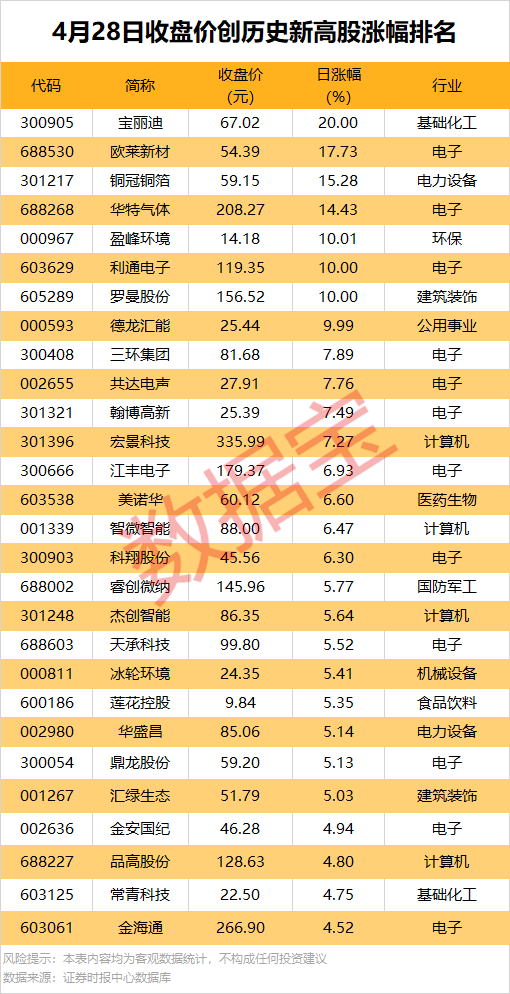 收盘价创历史新高股中,今日股价平均上涨4.71%,涨停的有宝丽迪、盈峰环境、利通电子等,涨幅居前的有欧莱新材、铜冠铜箔、华特气体等。