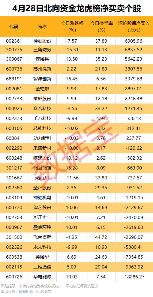 今日龙虎榜现身个股中,11股获北向资金净买入。北向资金净买入居前的是神剑股份和三角防务,金额均超6800万元;安诺其、苏州高新和智洋创新均获净买入超3000万元。