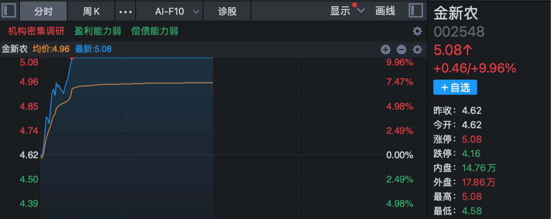猪肉、鸡肉、饲料、动物保健等细分板块也纷纷跟涨,金新农(002548)强势涨停,华统股份、乖宝宠物、生物股份、唐人神等涨幅居前。