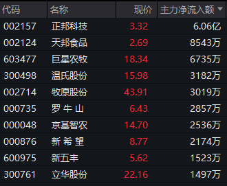 Wind实时监测数据显示,截至午间收盘,申万二级养殖行业获得9.68亿元主力资金净流入,其中正邦科技获得逾6亿元净流入,天邦食品、巨星农牧、温氏股份等均获得超1000万元净流入。