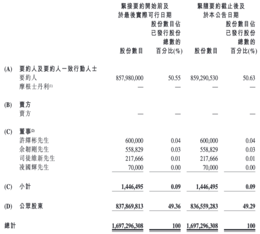最新股权结构显示,相关股份过户后,要约人及要约人一致行动人士共拥有、控制或有权指示合共8.59亿股耀才证券股份,占已发行股本及投票权约50.63%;另有49.29%的股份由公众股东持有。