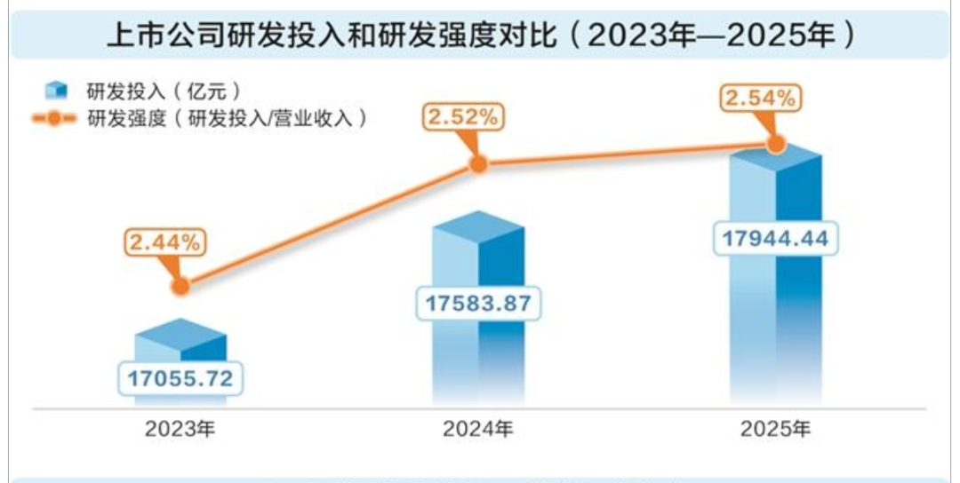 据国家统计局数据,2025年全社会研发投入总规模为3.92万亿元,A股上市公司占全社会研发投入的比例为45%,成为国家创新体系的核心载体。事实上,高强度研发不仅推动技术快速迭代,更转化为实实在在的业绩增长,研发投入居前的上市公司2025年多数实现营收增长。