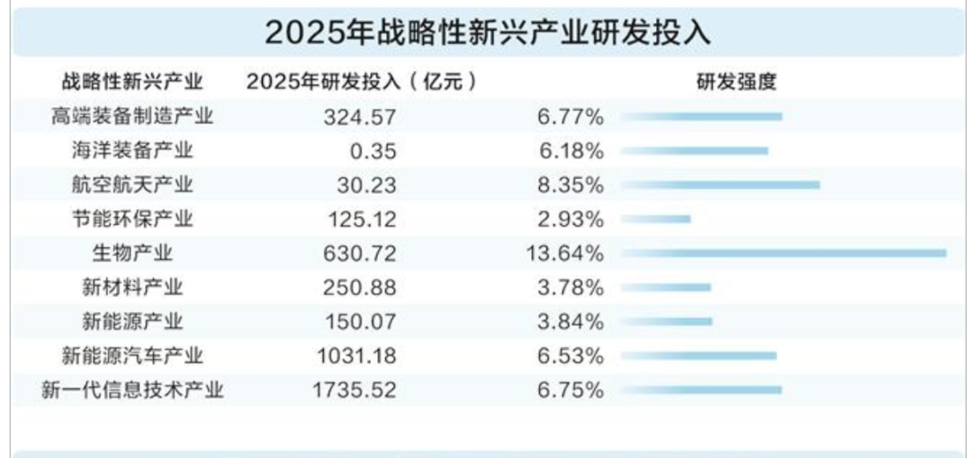 据最新数据统计,上市公司合计研发投入1.85万亿元,在营业收入中的比重达2.6%。战略性新兴产业作为科技企业的“创新策源地”与“硬科技主战场”,2025年研发投入达4278.63亿元,同比增长12.28%,占全市场比重提升至23.84%,新一代信息技术、新能源汽车产业研发支出均超过千亿元。