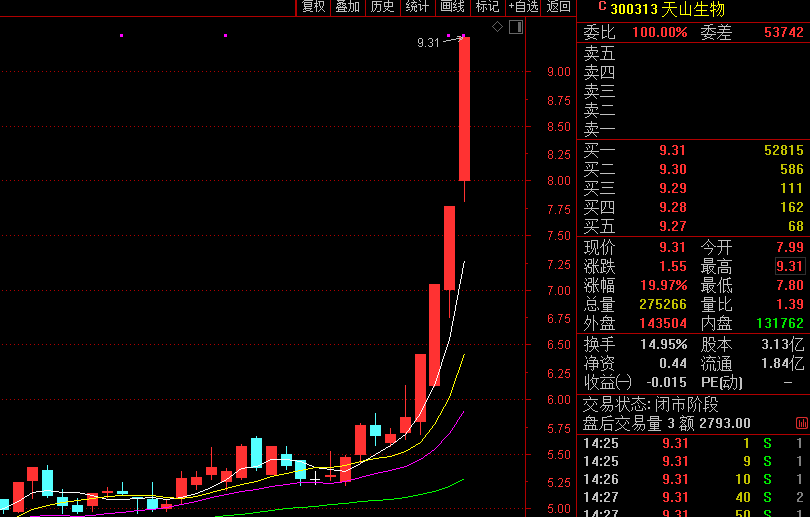 天山生物盘中也快速走强,直线封板,成为首只封死20%涨停的创业板个股,该股此前已经3个10%涨停。中潜股份、田中精机随后也“尝鲜”20%涨停板。汇金股份、古鳌科技、超频三、西部牧业等逾10只创业板个股盘中涨幅也超过10%。