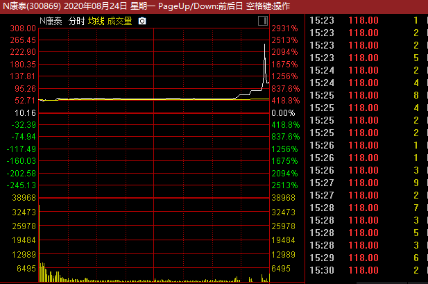 周一,是第一批创业板注册制企业上市的首个交易日,截至收盘,18只新股平均上涨212.37%,其中康泰医学涨幅最高,上涨1061%。康泰医学尾盘一度剧烈震荡,在第二次临停后股价快速拉升,不到3分钟的时间,由88元上涨766%,直线拉升至最高308元,涨2931%。