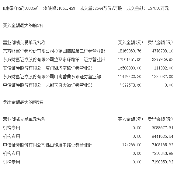 盘后龙虎榜数据显示,游资俱乐部东方财富证券旗下营业部在康泰医学交易中表现活跃。买一东方财富证券拉萨团结路第二营业部、买二东方财富证券拉萨东环路第二营业部、买四东方财富证券山南香曲东路营业部分别净买入1339万元、1428万元、1011万元,买入前五席合计净买入6350万元。而卖一、卖二、卖四、卖五均为机构专用席位,但整体卖出量都不大,没有一个席位净卖出超千万元,卖出前五席合计净卖出3919万元。