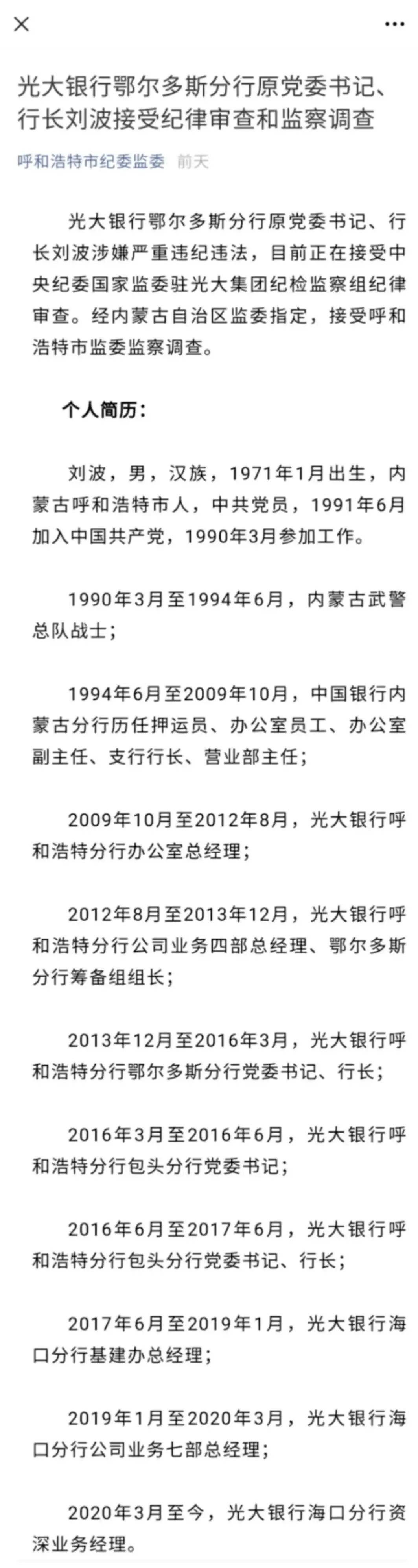 8月24日,微信公众号“呼和浩特市纪委监委”发布消息,光大银行鄂尔多斯分行原党委书记、行长刘波涉嫌严重违纪违法,目前正在接受中央纪委国家监委驻光大集团纪检监察组纪律审查。经内蒙古自治区监委指定,接受呼和浩特市监委监察调查。