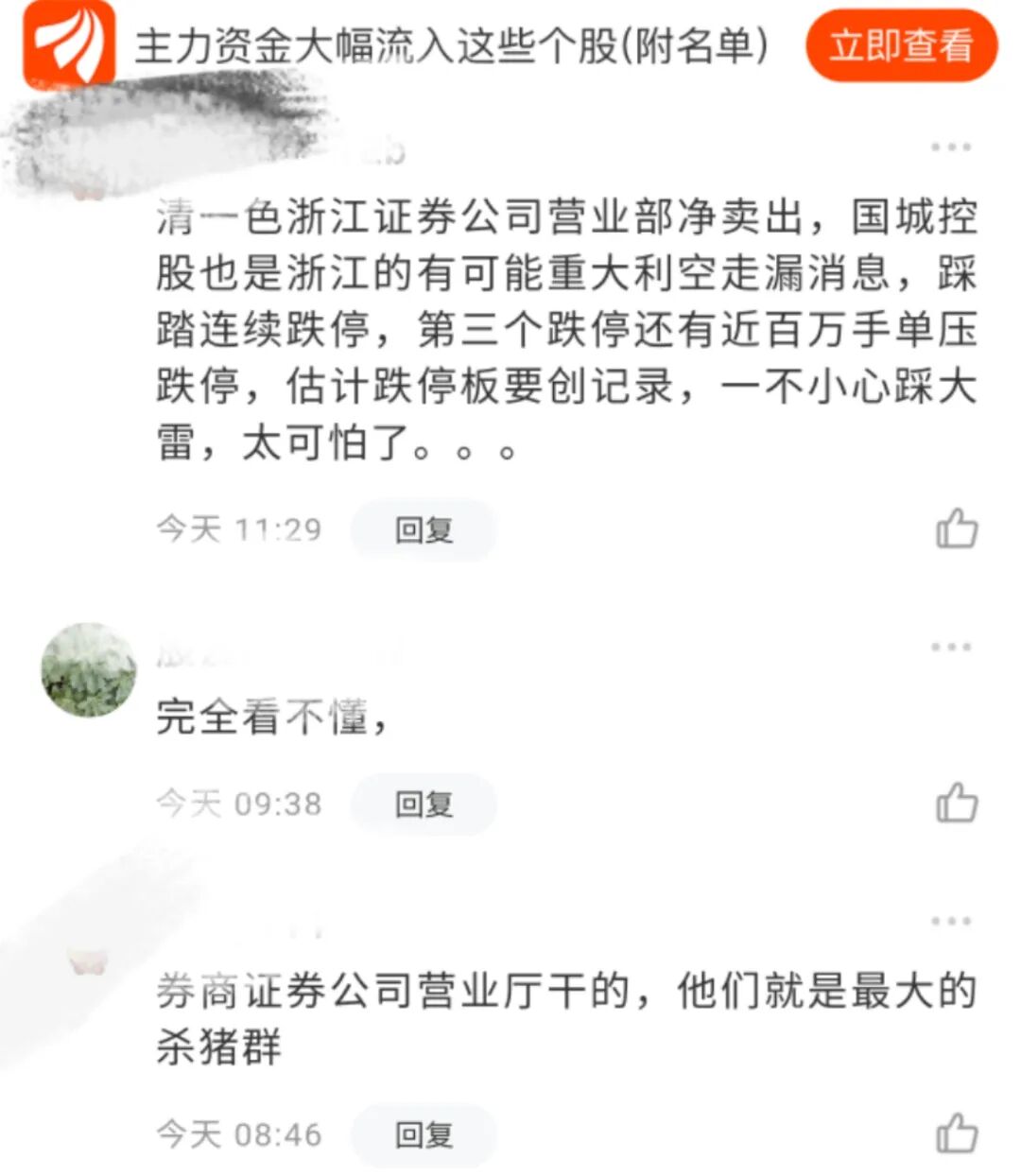 还有人在国城矿业的股吧称,“这种走势估计是公司内部重大问题。”“清一色浙江证券公司营业部净卖出,国城控股也是浙江的有可能重大利空走漏消息,踩踏连续跌停,第三个跌停还有近百万手单压跌停……”。