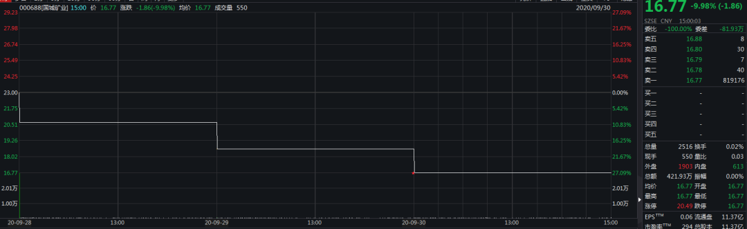 另一只已经连续两个交易日一字跌停的个股国城矿业今早开盘再次一字跌停,近百万手卖单罕见封死在跌停板上。截至收盘,国城矿业报16.77元/股,最新市值191亿元。