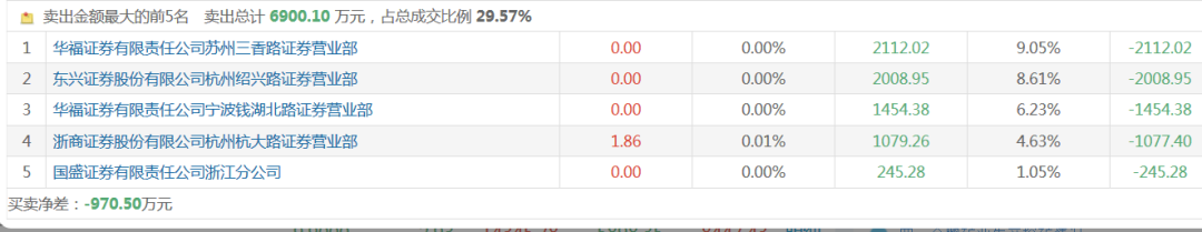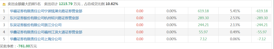其中华福证券有限责任公司宁波钱湖北路证券营业部位于卖一席位,净卖出619.18万元;东兴证券股份有限公司杭州绍兴路证券营业部净卖出289.3万元;位于卖四席位的华鑫证券有限责任公司福州江滨大道证券营业部卖出55.97万元。