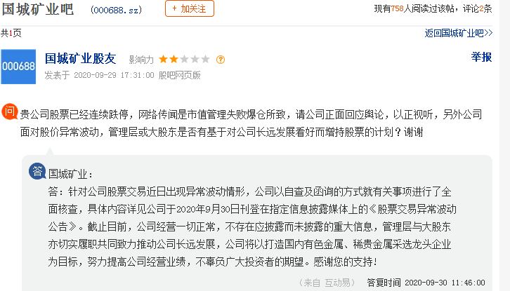 基金君注意到,有股民在国城矿业互动平台上提问,“贵公司股票已经连续跌停,网络传闻是市值管理失败爆仓所致,请公司正面回应舆论。”