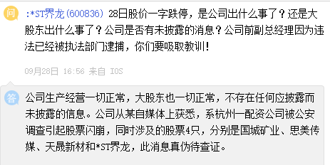 对此,*ST界龙今日在互动平台表示直接指出,公司从某自媒体上获悉,系杭州一配资公司被公安调查引起股票闪崩,同时涉及的股票4只,分别是国城矿业、思美传媒、天晟新材和*ST界龙,此消息真伪待查证。