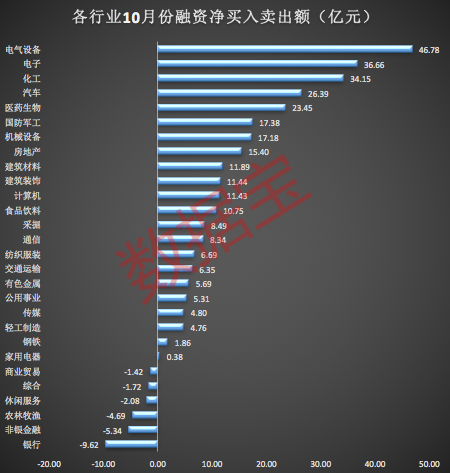 分行业来看,10月份,杠杆资金对大部分行业选择加仓。统计显示,28个申万行业中有22个行业的杠杆资金为净流入,融资净买入额超10亿的有12个。其中,电气设备以46.78亿元的融资净买入额排名第一,其次为电子、化工行业,其融资净买入额分别为36.66亿元、34.15亿元。