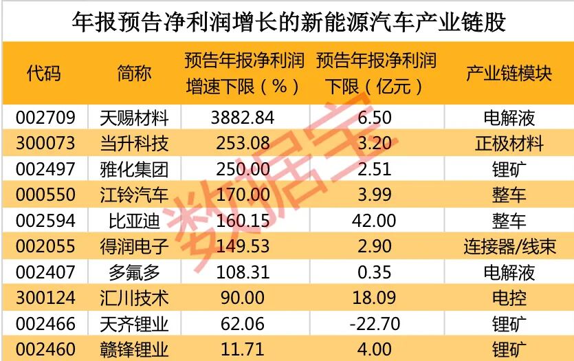 其他业绩预增幅度较大的还有当升科技、雅化集团,净利润预增下限超过250%,江铃汽车、比亚迪、得润电子、多氟多全年预告净利润增幅下限均超过100%。