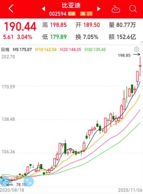 A股围绕新能源汽车的炒作同样火热,万得新能源汽车指数累计上涨近40%,产业链个股接连爆发。比亚迪周线6连涨,昨日盘中最高股价逼近200元关口,总市值突破5000亿元,电池巨头宁德时代市值突破6000亿元。