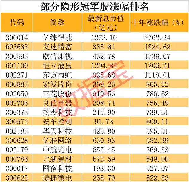 有些隐形冠军已经获得了巨大的成长。比如,长江证券2013年研报认为亿纬锂能是智能交通领域隐形冠军,如今该股市值破千亿大关,近十年涨幅超过27倍。艾迪精密被中金公司认为是破碎锤隐形冠军,近十年股价涨幅超18倍。另外,近视防控领域的隐形冠军欧普康视、工程机械液压件隐形冠军恒立液压(彼时简称恒立油缸)、东方雨虹等个股十年涨幅均超过十倍。