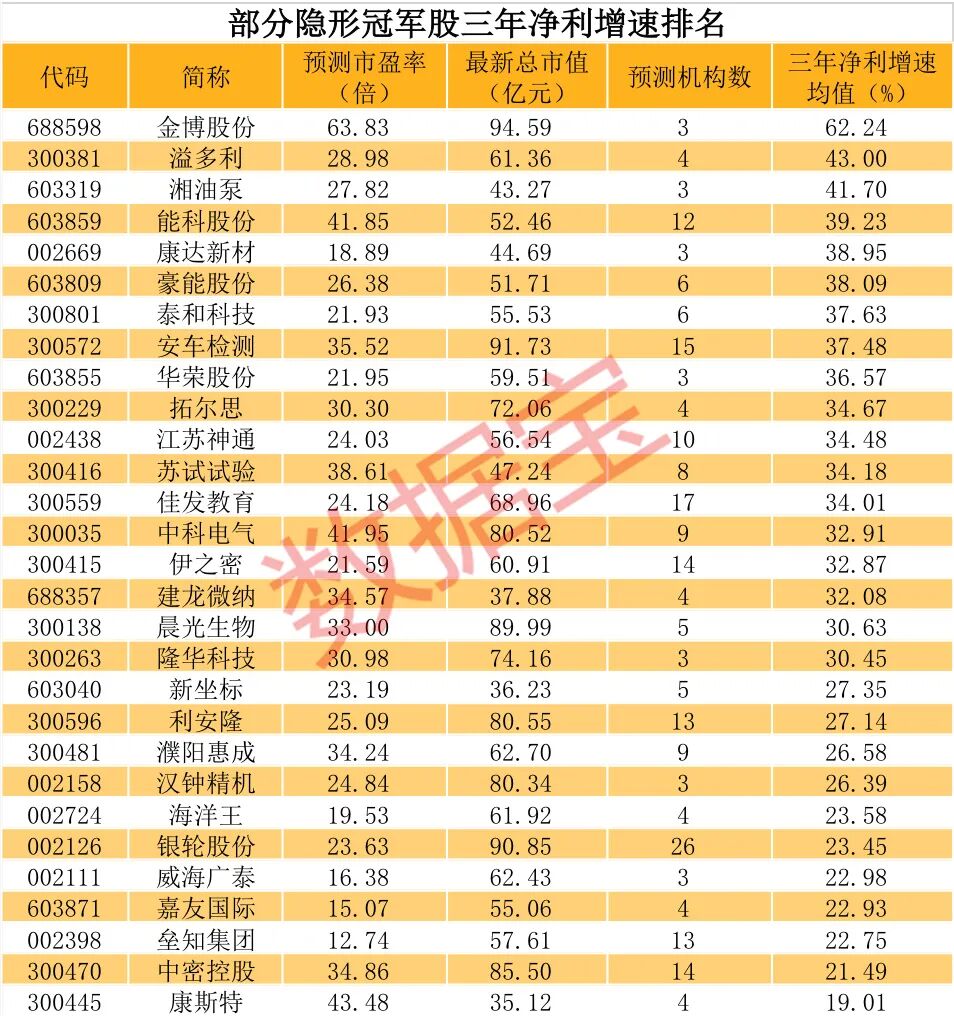 根据机构一致预测净利增速,苏试试验、能科股份、泰和科技、华荣股份、安车检测、金博股份等个股今年、明年及2022年净利同比增速均有望超过30%。以三年净利增速均值来看,金博股份超62%居首,溢多利、湘油泵、能科股份、康达新材等20多只个股增速超30%。