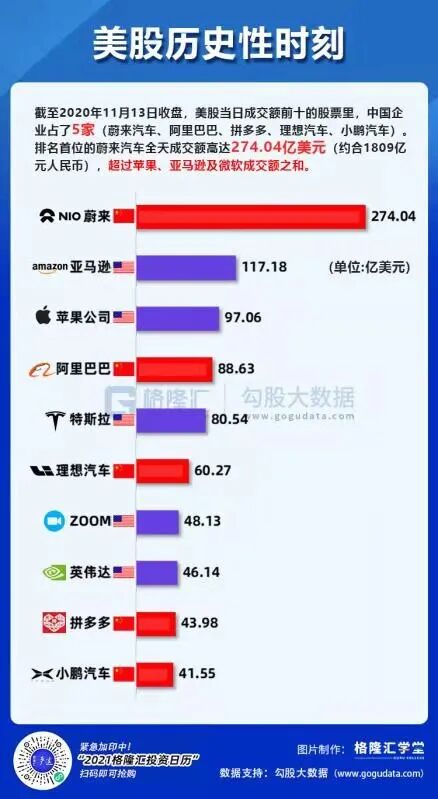 在本周五美股成交额排名前十的榜单中,来自中国的公司竟然占了5席,它们分别是蔚来汽车、阿里巴巴、理想汽车、拼多多、小鹏汽车。