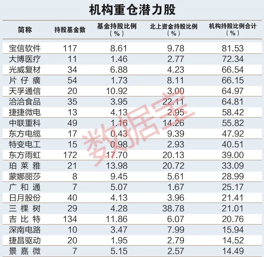 二十大潜力股均为机构的重仓股,机构持股比例超过14%,机构持股比例过半的有8股,其中宝信软件、大博医疗等持股比例居前。