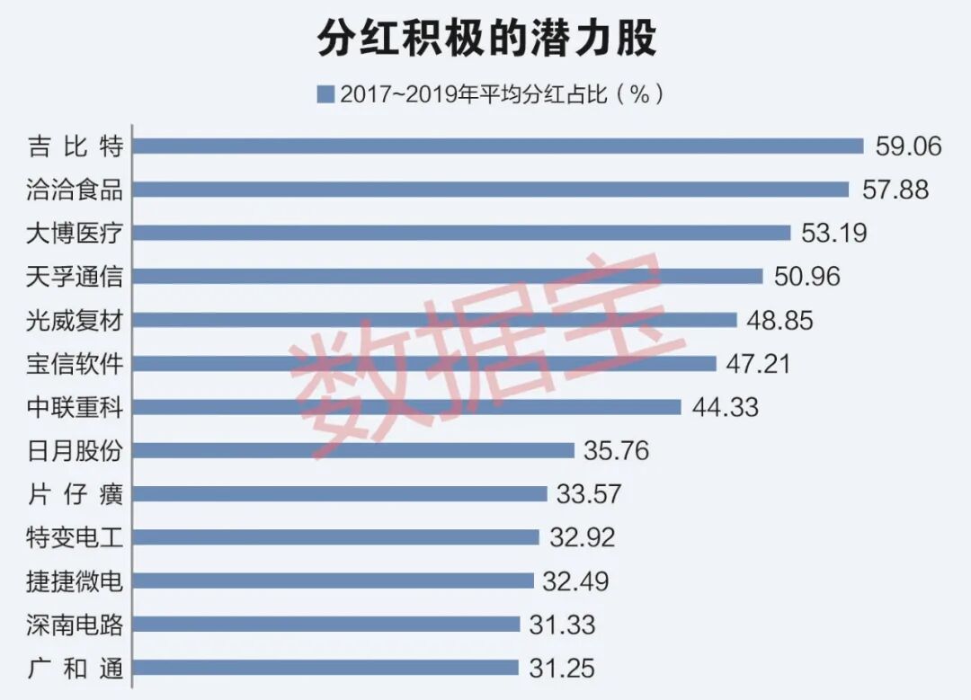 从现金分红在净利润中占比来看,二十大潜力股2017年~2019年的平均分红占比均值为37%。吉比特、洽洽食品、大博医疗和天孚通信的平均分红占比均超过50%,股东回报意识最强。