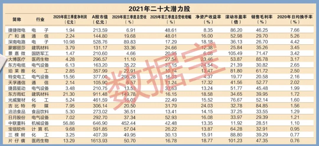 疫情过后全球经济共振复苏是2021年确定性事件,哪些股票能成为2021年的潜力股呢?证券时报·数据宝结合股票基本面、行业前景、机构观点、主力动向等多维度指标遴选出2021年二十大潜力股。
