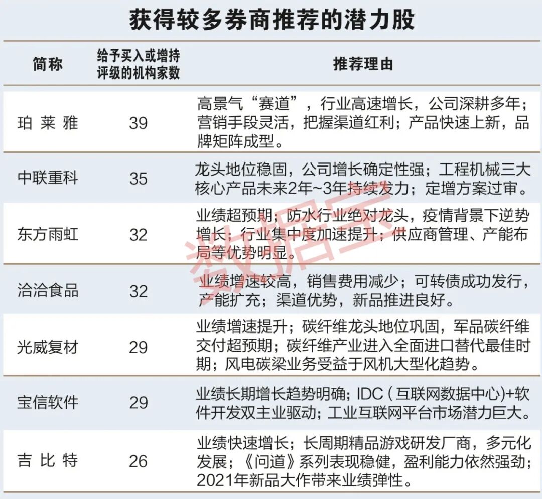 二十大潜力股覆盖华为、5G、新基建、芯片、风电等多个热点概念,所处赛道优质,在细分领域内龙头地位显著。二十大潜力股普遍得到机构青睐,近期合计获得412个机构给予的买入或增持评级,珀莱雅、中联重科、东方雨虹、洽洽食品等7股获得的买入或增持评级数不低于25次。