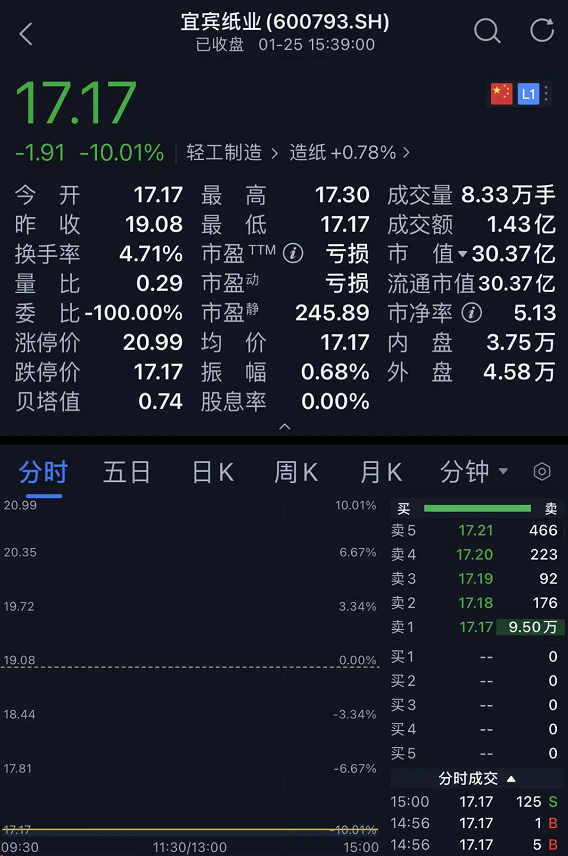 2021年第一只十连板的“妖股”宜宾纸业今日跌停,报17.17元,成交1.28亿元,总市值30.4亿元。截至收盘,卖一封单超9万手。