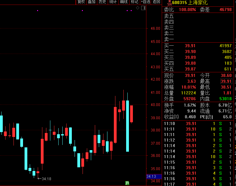 今日,上海家化果然出现与昨日截然不同的反应,开盘大幅跳空高开6.39%,随后直线封涨停。截至午间收盘,报收39.91元,成交4.43亿元,涨停封单4.2万手。