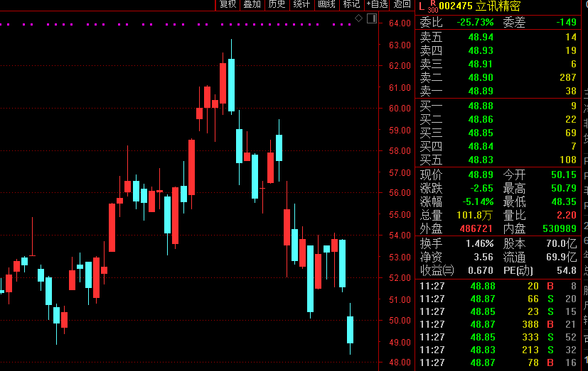 2月4日,立讯精密开盘后跳空下跌,跌幅最大接近6%,截至上午收盘,公司收跌5.14%,报48.89元/股,最新市值为3433亿元。