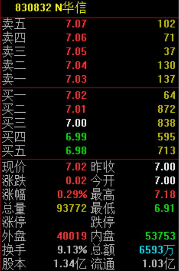 齐鲁华信挂牌首日表现不过不失,从盘中走势来看并无惊艳表现,其以7.03元的价格略为高开,随后反复震荡,盘中最高价为7.18元,最低则触及6.91元,收盘报7.02元,微涨0.29%,成交937.72万股,成交金额6593.36万元,换手率为9.13%。