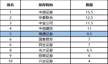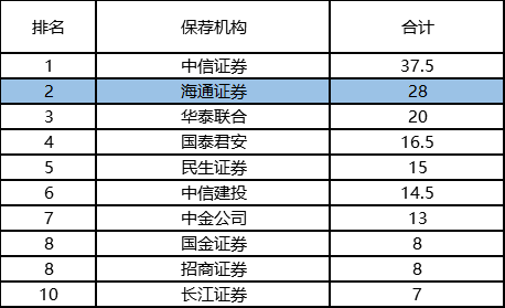 截至2020年12月31日,海通证券科创板IPO挂牌数量9.5家,市场排名第5。